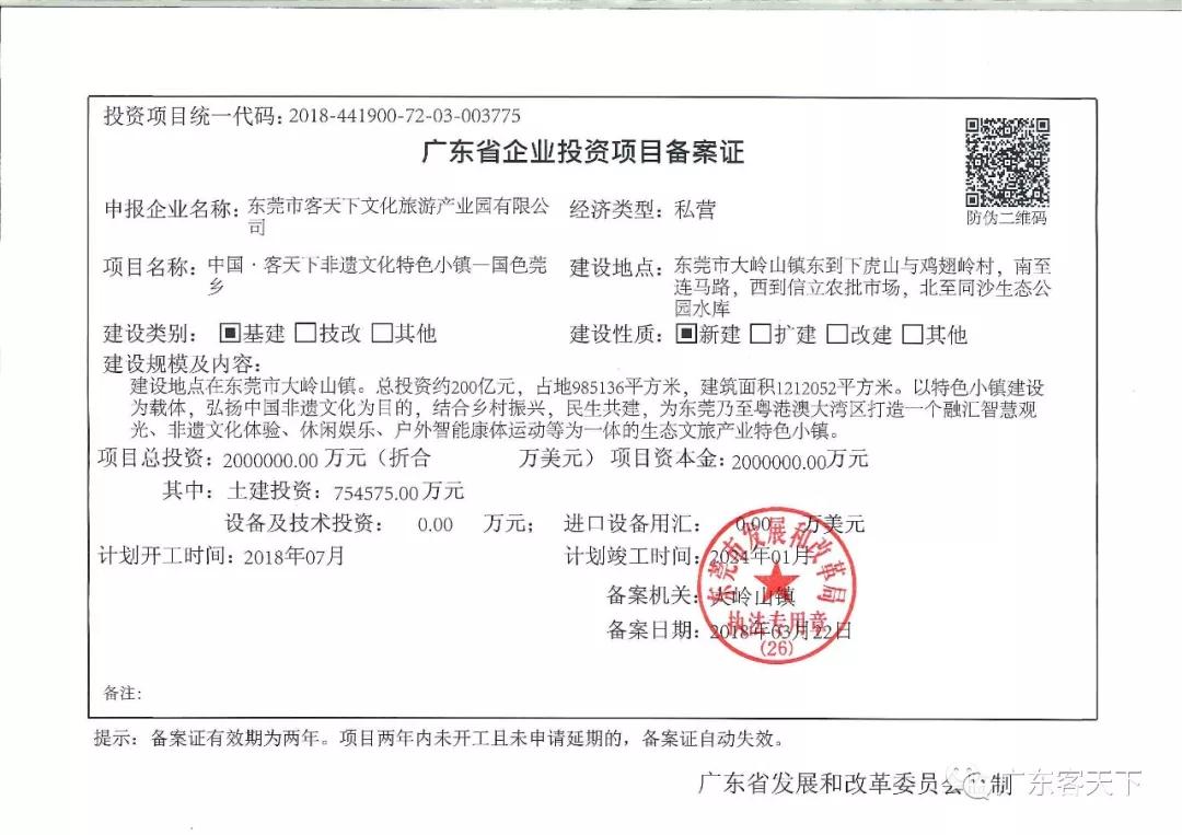 2018年3月22日,在東莞市委市政府和大嶺山鎮委鎮政府的大力推動下,客天下東莞公司傾心打造的大嶺山特色小鎮項目“中國·客天下非遺文化特色小鎮——國色莞鄉”,正式通過廣東省發展和改革委員會審批立項,標志著項目推進邁出重要一步,取得了突破性進展。