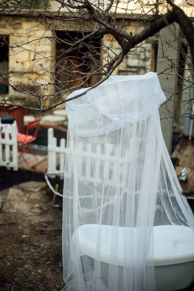 櫻花樹下的浴缸與紗帳,