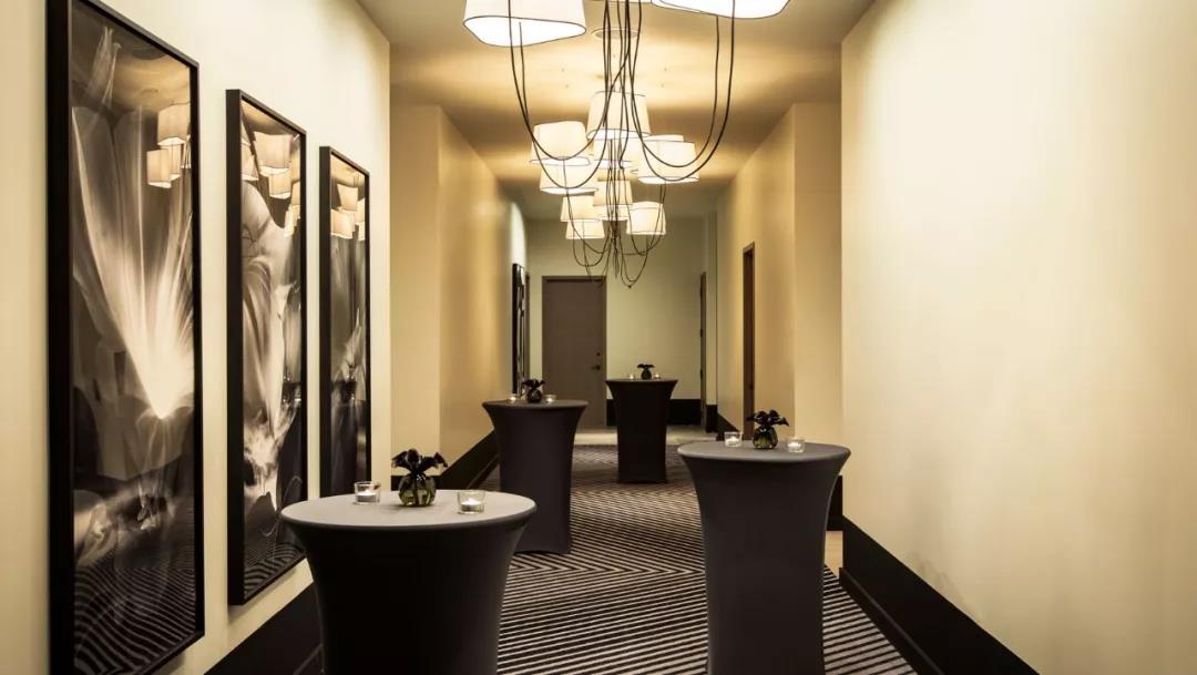 定制家具和固定裝置,如懸掛式燈籠、六英尺圓形燈燭臺、弧形黃銅天花板細節以及皮質墻壁增添了酒店獨特的空間感。