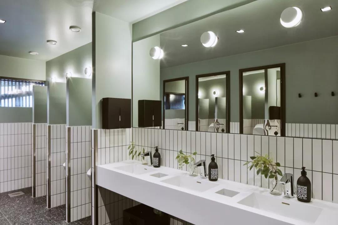 公共區域的廁所設計利用高級灰的粉色與綠色營造出時尚的氛圍,但在墻圍子和隔間的設計上則凸顯出了復古感。