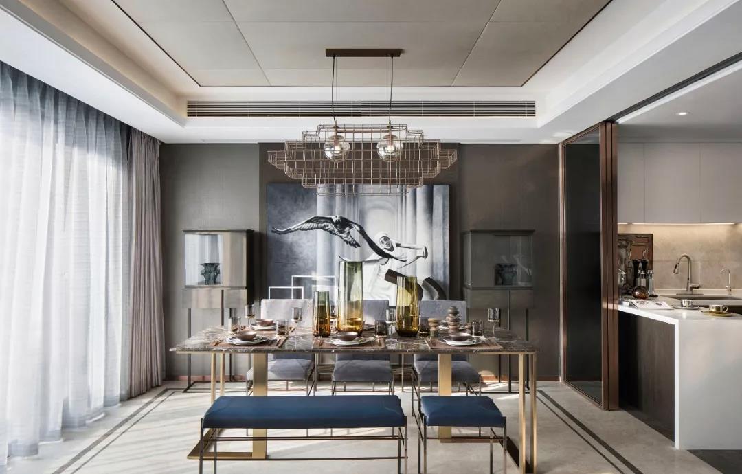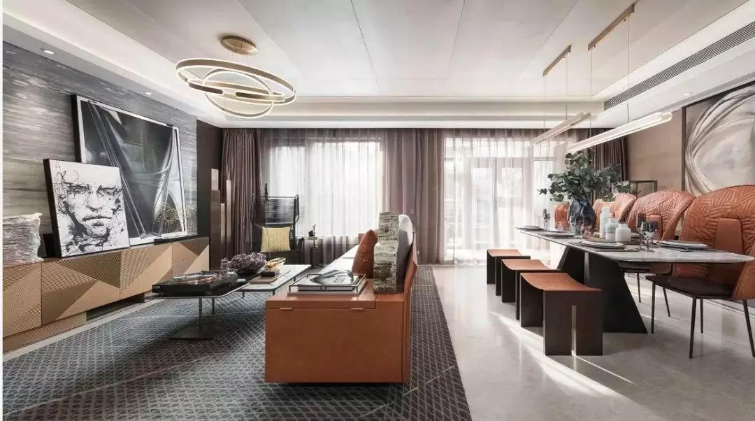低飽和度的淺橙色與藍(lán)色之間有幽微的碰撞,別致的金屬異型吊燈,與家具的線條結(jié)構(gòu)相互呼應(yīng),營造出與眾不同的空間魅力,其中有溫暖的冷靜、個性的簡約。