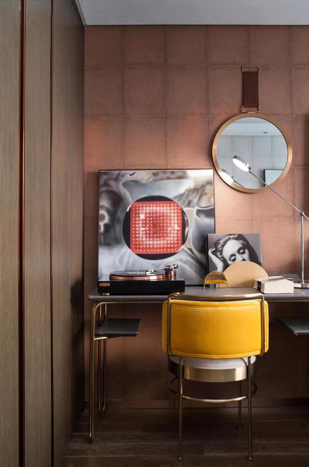 主臥設(shè)計(jì),中性偏暖的色調(diào)賦予空間曖昧多義的可能,軟裝床品散發(fā)出柔軟曼麗的味道。大幅裝飾畫帶有大氣粗獷的野性,彰顯出后現(xiàn)代的非連續(xù)性和多元化,讓空間充滿時尚、不羈的誘惑力。