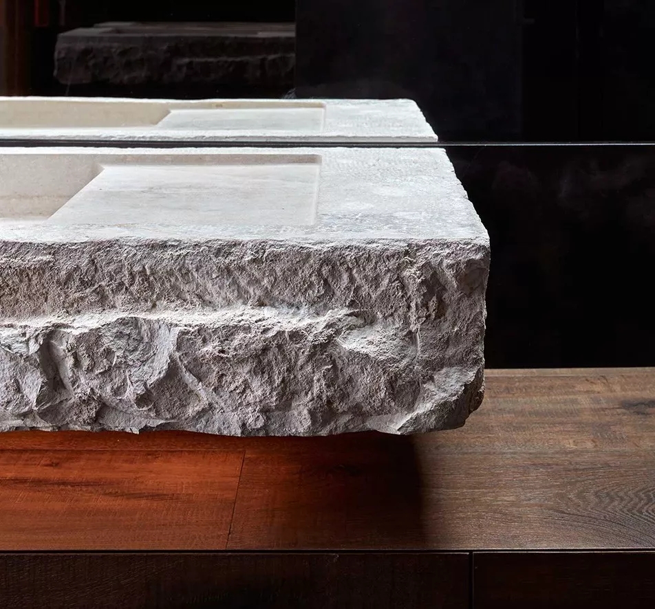 踩著石板地進入衛生間,木板墻上的銅制器具和擁有原始形狀的石料臺盆,營造出一個別致的高雅氛圍。