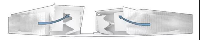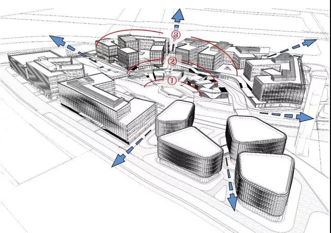 城“勢”訴求的是建筑的態度。形“意”更注重表達建筑形體的語言。通過建筑與建筑的組合、建筑自身形體的塑造、建筑對外立面的表達,展現建筑師設計所要闡述的意境。寧波前洋E商小鎮是基于“爆炸”的設計概念進行設計的。爆炸不僅產生向心的建筑形態,也在建筑的立面、功能和分區上劃分出自內而外的三層同心圓:最外側的辦公板塊、中層的共享空間、內層配套體驗空間。