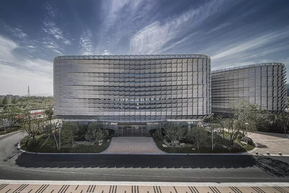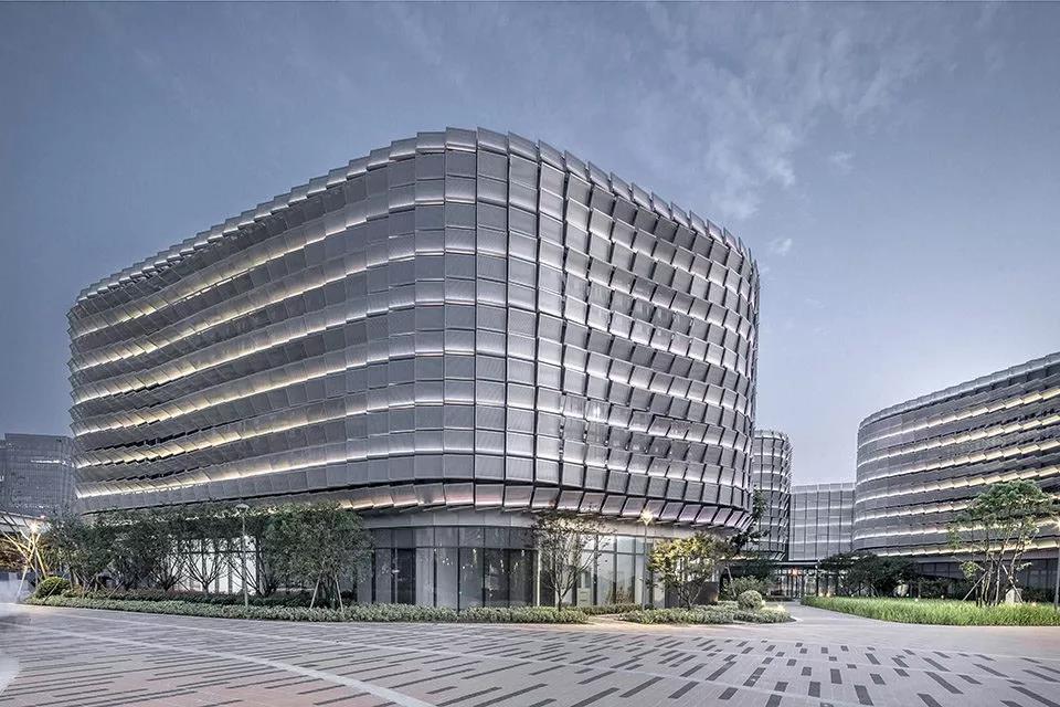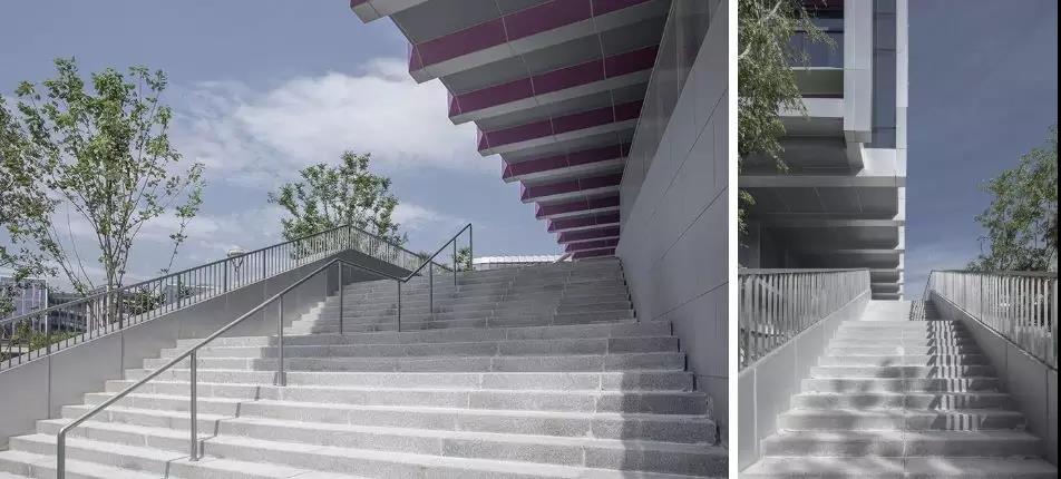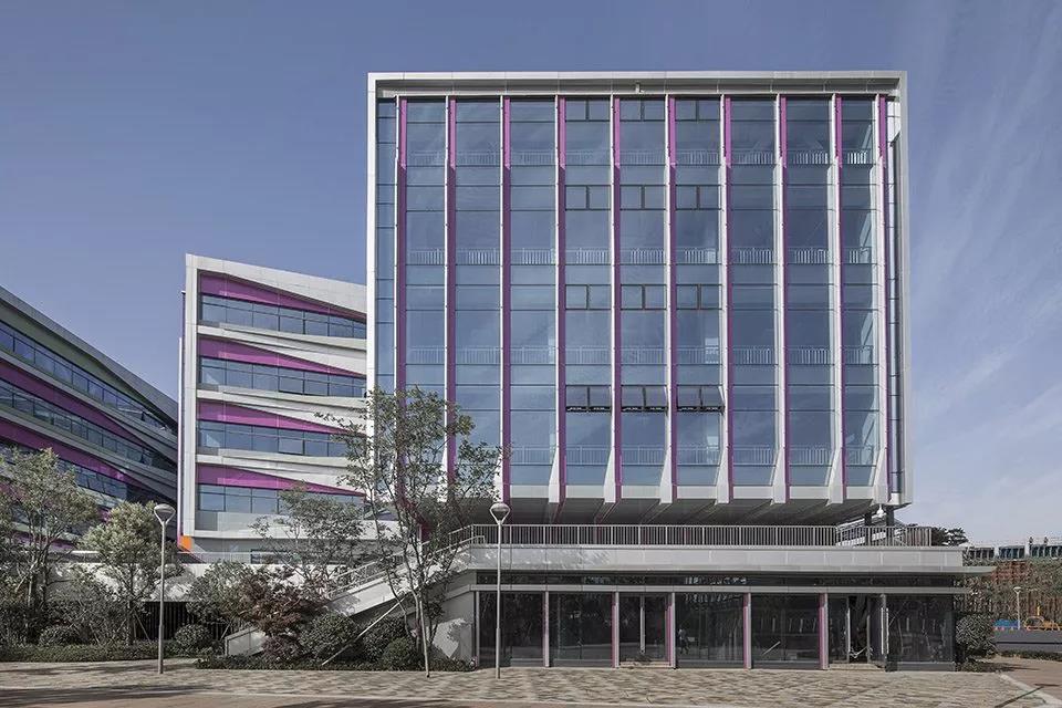 辦公空間的最外側沿街立面設立了兩種系統的立面。其中最吸引眼球的就是延續百米的鋁合金遮陽百頁板。每一塊金屬板都經過嚴密的角度推敲,組合后猶如風吹過引起的金屬漣漪一般起伏延續,為建筑制造了會呼吸的輕盈感和科技的時尚感,在立面上輕松的拉開了與傳統項目的距離。材質上采用了由3mm穿孔金屬旋轉鋁板,既不會造成太過耀眼的光反射,也為建筑內部提供了足夠的自然光線。配套內襯的鋼化玻璃具有極高的安全性和有好的節能性:傳熱系數<2.0,遮陽系數<0.4,透射比>0.45,反射率<0.16,在前洋E商小鎮中,所有玻璃幕墻都采用了這種節能安全的產品。在建筑的東北角,設計師選取了3mm厚的條形彩色鋁板與鋁合金拉伸網板組合的系統。根據樓梯的線條訂制的鋁合金拉伸網與龍骨有效連接,塑造半透明的視覺效果,為園區的科技屬性增添了朦朧感和未來感。為了使中央景觀得到更加充分的滲透,左右的建筑師選取了大面積的玻璃幕墻作為面向景觀舞臺的立面。身處這樣的辦公空間,人們可以輕松透過全景窗面享受最大程度的景觀視野,真正將園區的景觀融入到工作環境當中。設計師在打造沿街和內部的銜接立面時,大膽采用了紫色和綠色拼接的斜向鋁合金遮陽板與條形玻璃幕墻進行組合。向外延展開的線條呼應了“爆炸”的設計核心,園區內部繪制了一組組靈動流暢的線條。
