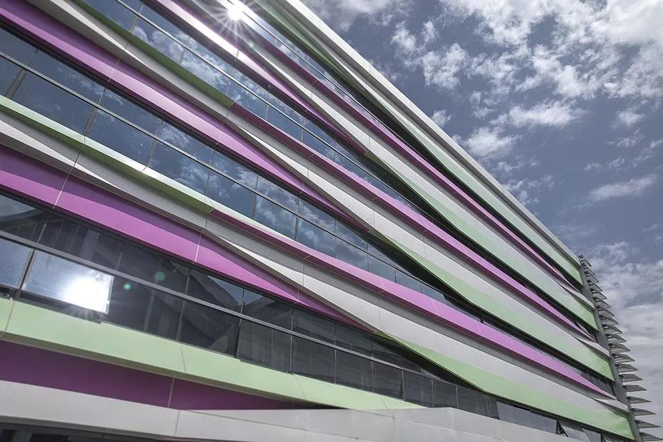 ▼紫色和綠色拼接的斜向鋁合金遮陽板與條形玻璃幕墻