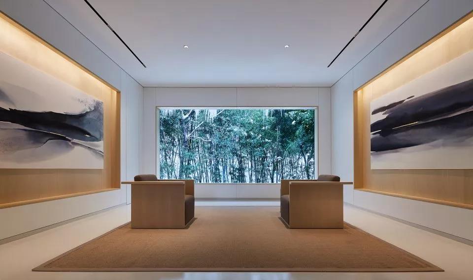 ▼洽談空間, 大尺寸中空玻璃形成巨幅畫卷,隨著冬去春來不斷變化