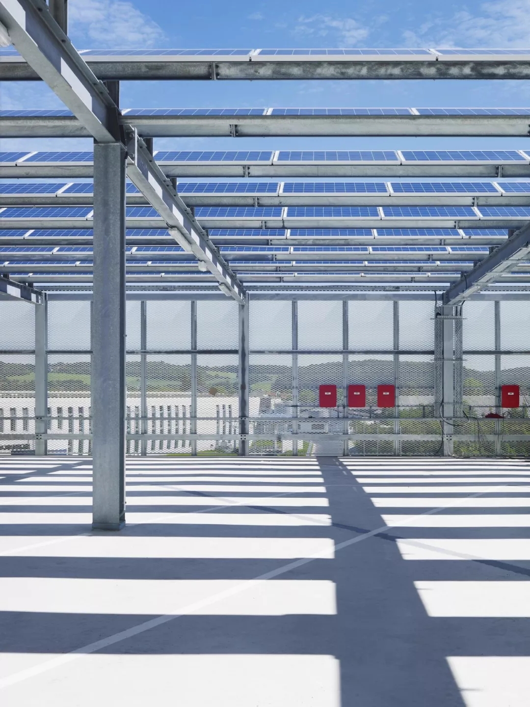 太陽(yáng)能電力系統(tǒng)覆蓋停車(chē)場(chǎng)頂層的空間