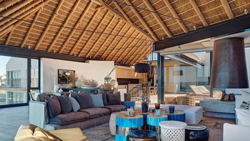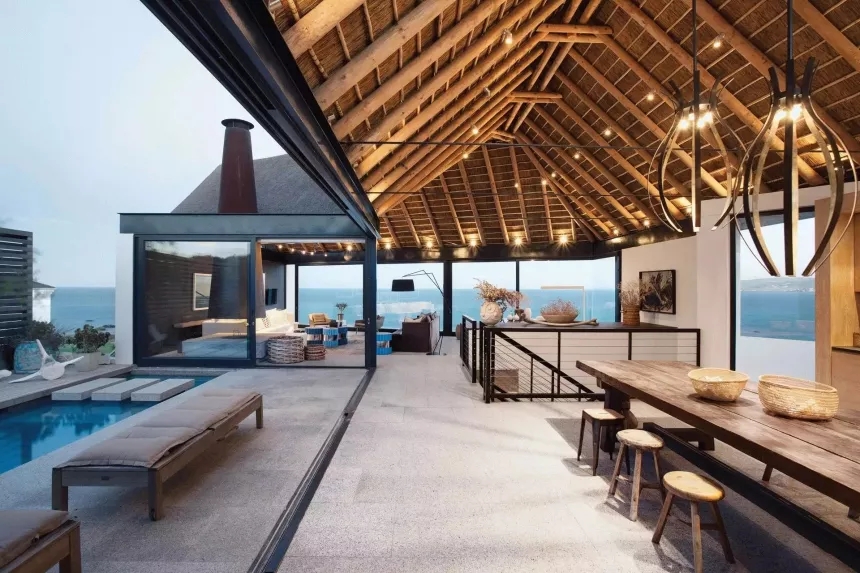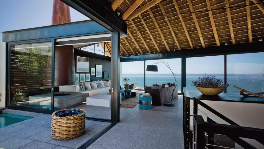 項目位于南非西海岸邊,使人不禁想到海子的那一句“面朝大海,春暖花開”。碧藍的大洋、成群的海鷗,一切都像是自然所賦予的寶藏。木制結構的屋頂配上泳池和庭院,幽靜而愜意。