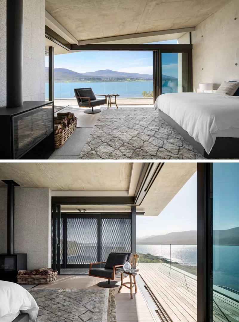 起居室的視野更是絕佳,超大落地玻璃窗引進戶外景色。墻面上銹板裝飾的區域是一處壁爐,巧妙的將壁爐和墻體結合在了一起。