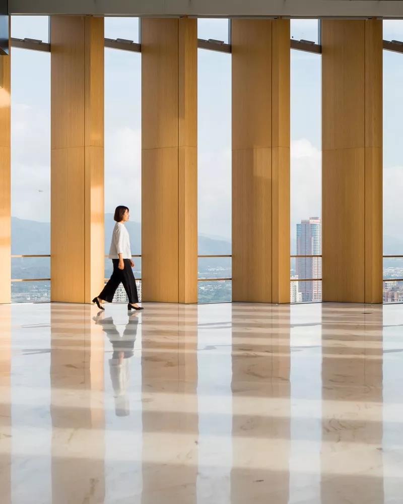 到日暮時分,不斷變化的透明度和立面上的曲線營造出一種木材的質感,又像一座垂直的山丘。幕墻之間打開狹長的縫隙,用來展示一些特殊空間,如會議室、行政辦公室和休息區等,使建筑從城市的不同部分呈現出鮮明的特色。