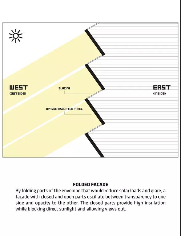 建筑通過在部分外立面上形成折疊的形態可以有效減少太陽直射得熱和眩光問題,表皮上既有封閉部分又有開放部分,在透明和不透明之間連續交替。封閉部分的隔熱性較好,在阻擋了陽光直射的同時仍然為內部人員提供了看向外部的視野。從遠處看,大樓的形體與傳統形式無異,但是表皮上的肌理有機而生動,走近看能進一步看到立面上排列優雅的折板。