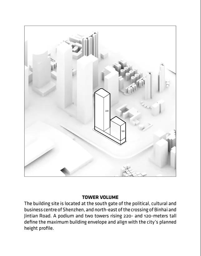 深圳能源公司新總部大樓的體量與高度完全按照城市中心區總體規劃的要求進行設計。該項目由兩座塔樓組成,其中北側塔樓高220米,南側塔樓高120米,并在底部由一座高34米的裙樓相連,裙樓中設有主要大廳、會議中心、自助餐廳和展覽空間。能源大廈與周邊的塔樓相協調,共同為深圳市中心形成了延綿起伏的天際線。