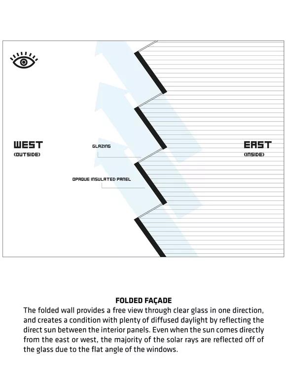 折疊的墻壁在同一個方向上安裝透明玻璃,可以讓視線自由通過,并通過在室內面板之間反射直射光為室內形成均勻充足的散射光線創造了條件。即便太陽在正東或正西方向上直接照射過來,大部分直射光也會被立面上翻折的不透明部分反射掉。