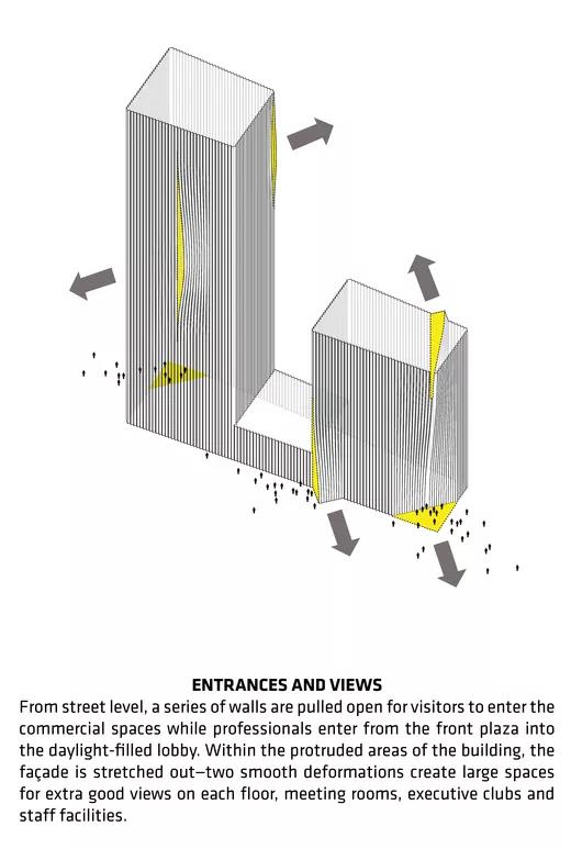 BIG 為兩座塔樓設計了起伏的立面,形成波紋狀的表皮,突破了傳統的玻璃幕墻的外觀。