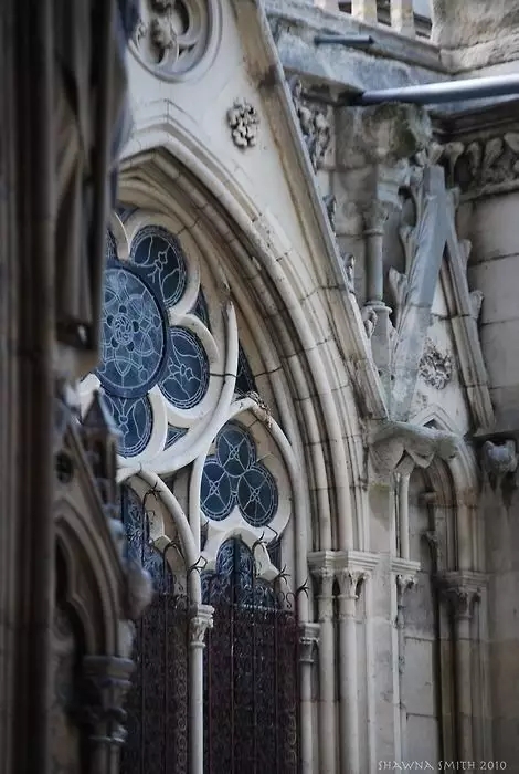 從外面仰望教堂,那高峻的形體加上頂部聳立的鐘塔和尖塔,使人感到一種向藍天升騰的雄姿。巴黎圣母院的主立面是世界上哥特式建筑中最美妙、最和諧的,水平與豎直的比例近乎黃金比1:0.618,立柱和裝飾帶把立面分為9塊小的黃金比矩形,十分和諧勻稱。后世的許多基督教堂都模仿了它的樣子。