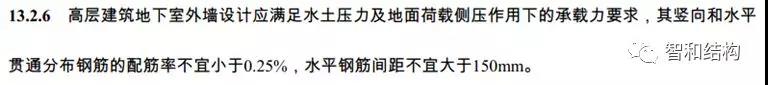 12.2.5高層建筑地下室外墻設計應滿足水土壓力及地面和在側壓力作用下承載力要求,其豎向和水平分布鋼筋應雙層雙向布置,間距不宜大于150mm,配筋率不宜小于0.3%。
