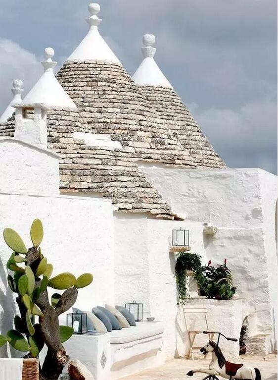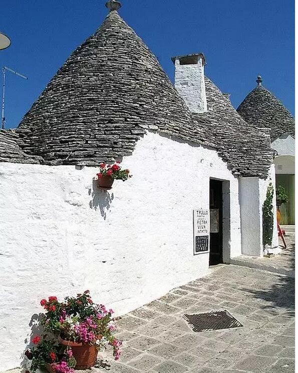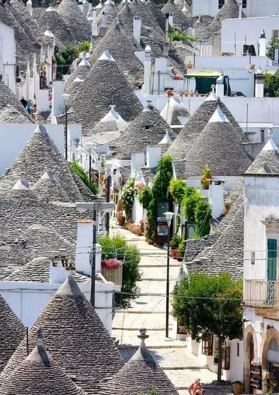 意大利的阿爾貝羅貝洛(Alberobello)被稱之為“天堂小鎮(zhèn)”。原是自然條件最差的不毛之地,最早的石屋可追溯到12世紀(jì),16世紀(jì)開始越來(lái)越多逃避天災(zāi)人禍的難民逃到這里,就地取材用石灰屋建屋。