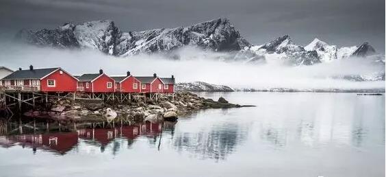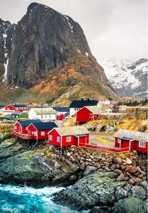 Hamnoy小鎮(zhèn)位于挪威沿海,小鎮(zhèn)上的房子多用紅色漆木,與挪威寒冷的冬天形成鮮明的對(duì)比。