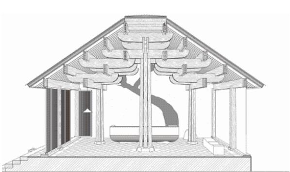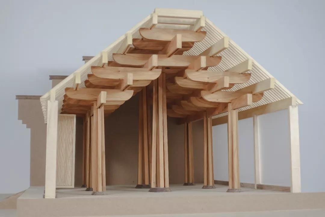 所有梁和柱通過榫卯的方式咬合在一起,形成了“散柱復梁”的屋架體系,沒使用一根釘子。