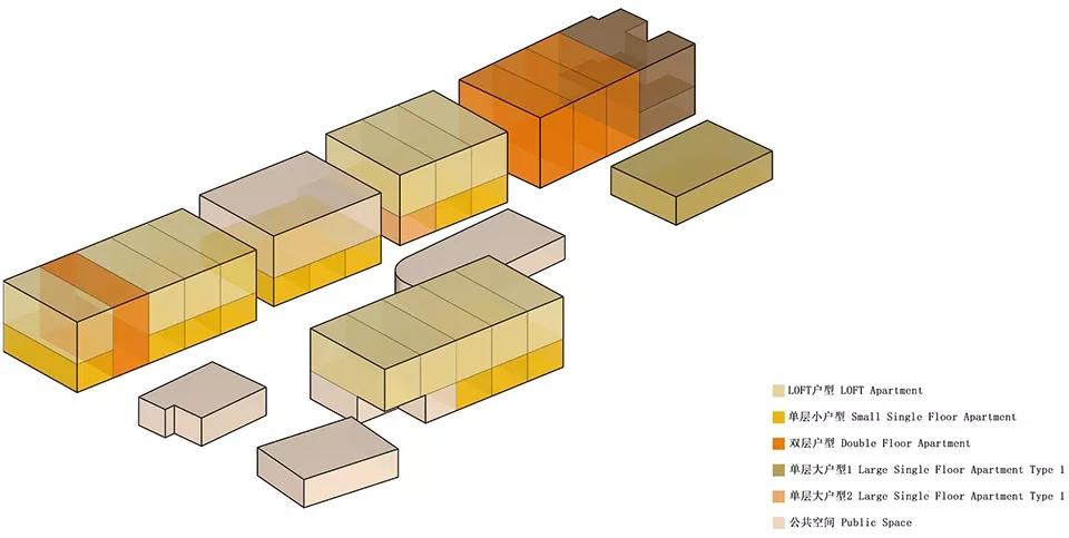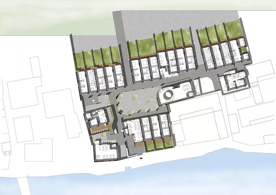 在功能分布上,項(xiàng)目的公共及輔助設(shè)施被安排在臨近入口的單層建筑中。北側(cè)靠中心庭院的樓棟二層為公共客廳,是項(xiàng)目最大的公共空間。項(xiàng)目中的單層建筑為獨(dú)棟居所,首層每套住房都帶有30平及以上面積的庭院,二層房間分為復(fù)式和單層凈高較大的房間,租戶可根據(jù)自身的喜好來靈活選擇不同類型的居住空間。