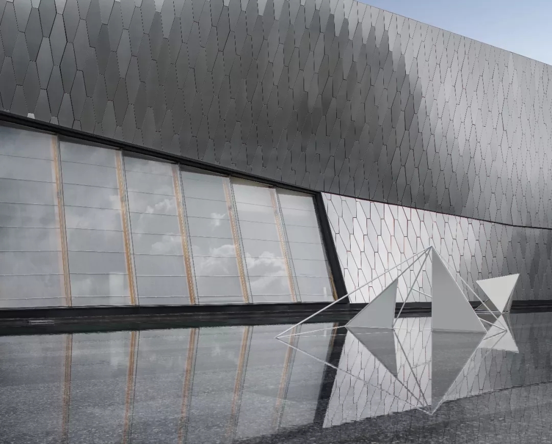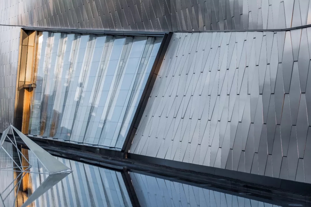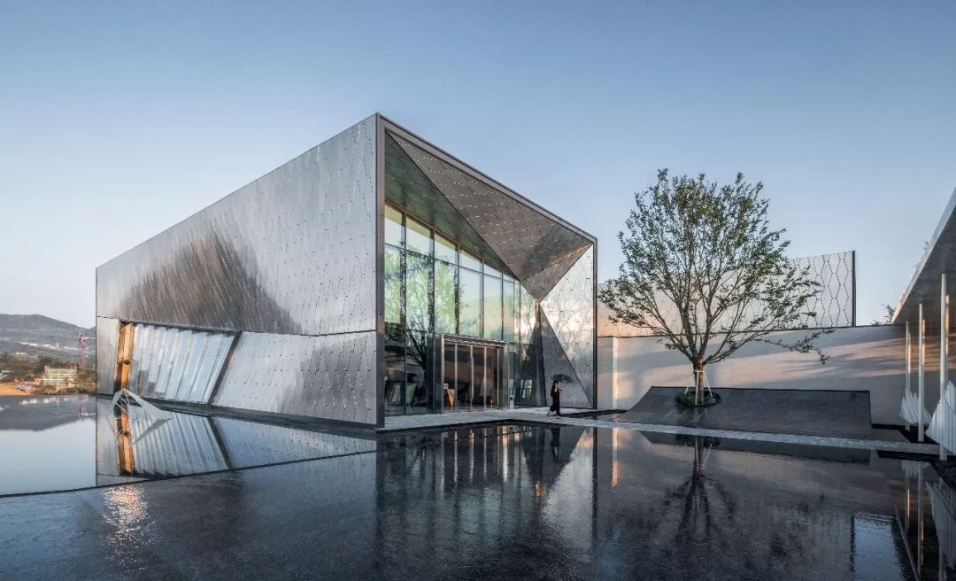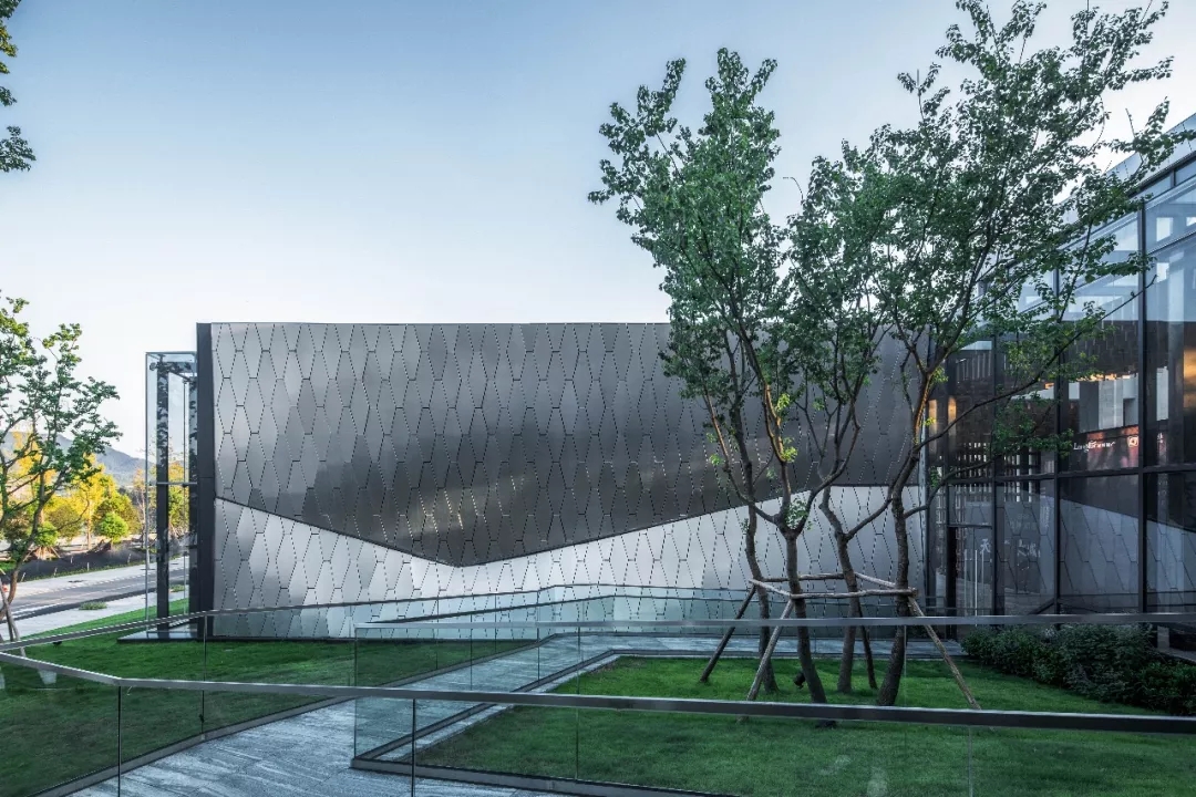 建筑師以六邊形鋁板作為主要界面材料,覆蓋于內部結構之上。表皮順應真實的建筑形態變化,每塊蜂窩鋁板精細包邊,開縫拼掛,細節考究。數字化的表現手法營造 出“Cyberpunk”(賽博朋克)的超時空現代感,表皮在自然光下形塑特質,追隨光線的變化,產生復雜而神秘的視覺效果。