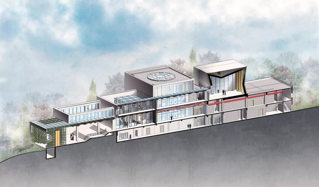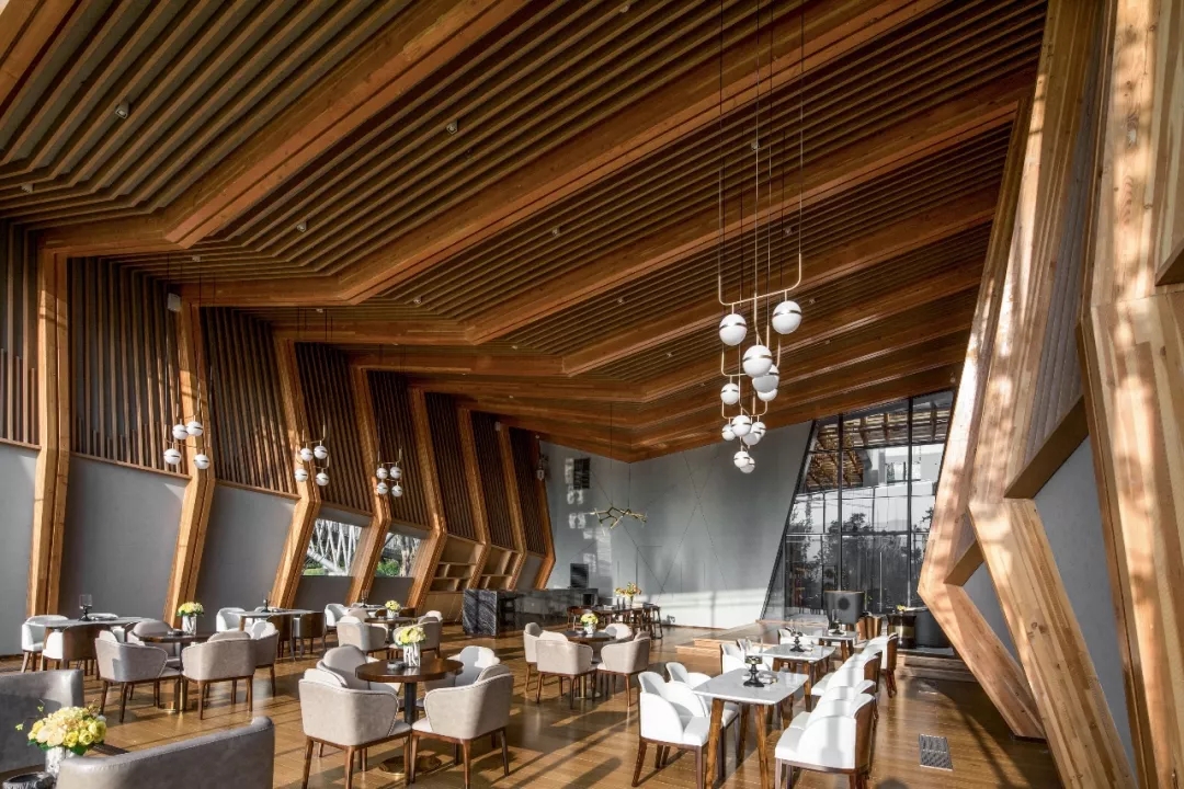 暴露的膠合木結構構件是建筑中最重要的視覺元素。建筑師以重慶傳統的折坡屋頂秩序的形式語言轉換成為建筑形體,抽取變化的單元模式轉為結構構件,多片構件以秩序和變化排列組合,產生緊密的空間與形體的變化。