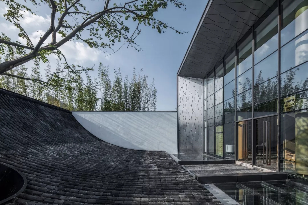 建筑師依據功能將每一個建筑空間依序形成不同的體量,展覽廳、書吧、游泳池、餐廳等順次形成多重院落空間,虛實空間的變化過渡一如中式游園,將傳統中式意境融入現代空間中。
