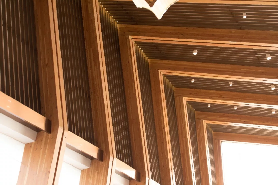 木構件筆直搭接,嚴整清晰,建構感強。流暢的線條和統一的韻律感使建筑空間極具張力。構件體現出的動態平衡,豐富了建筑語言,將空間變得非常具有戲劇化。