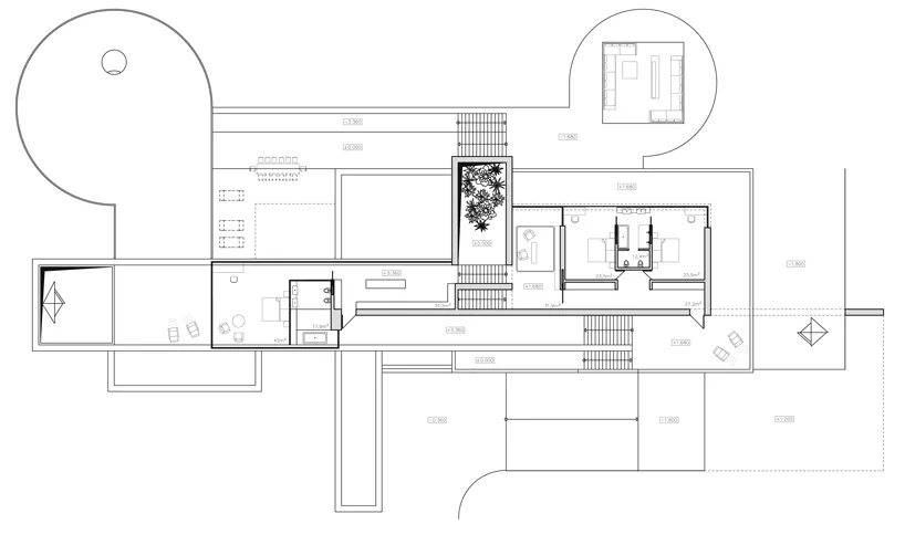 房子的后面,設置了車庫和花園的主要入口,而且使用了大量圓形結構,類似于中國的月亮門,也呼應了住宅名字中的oko。