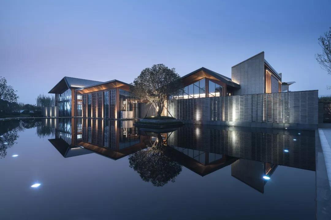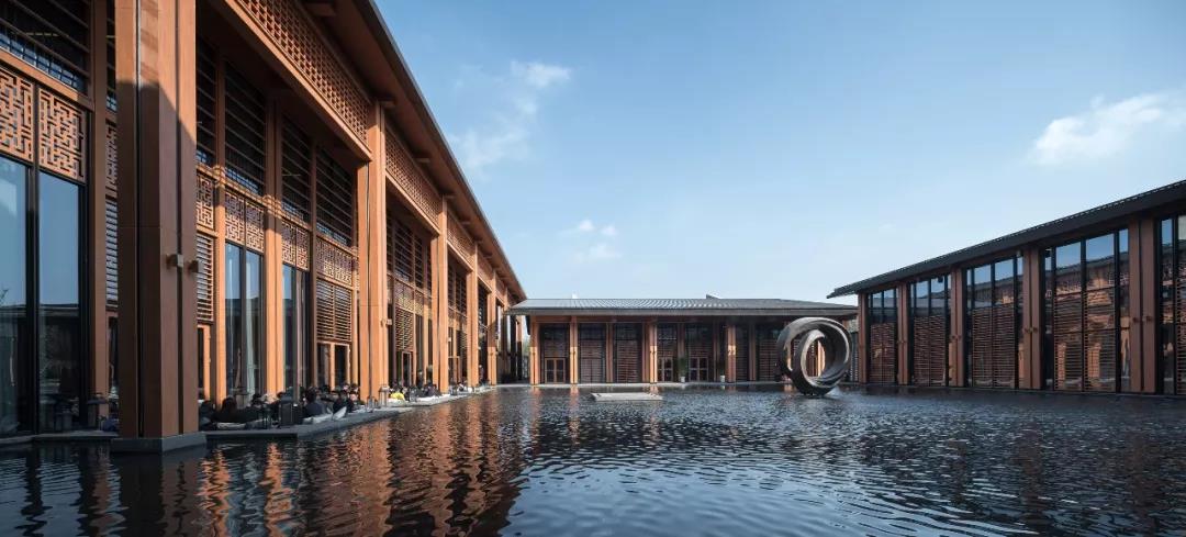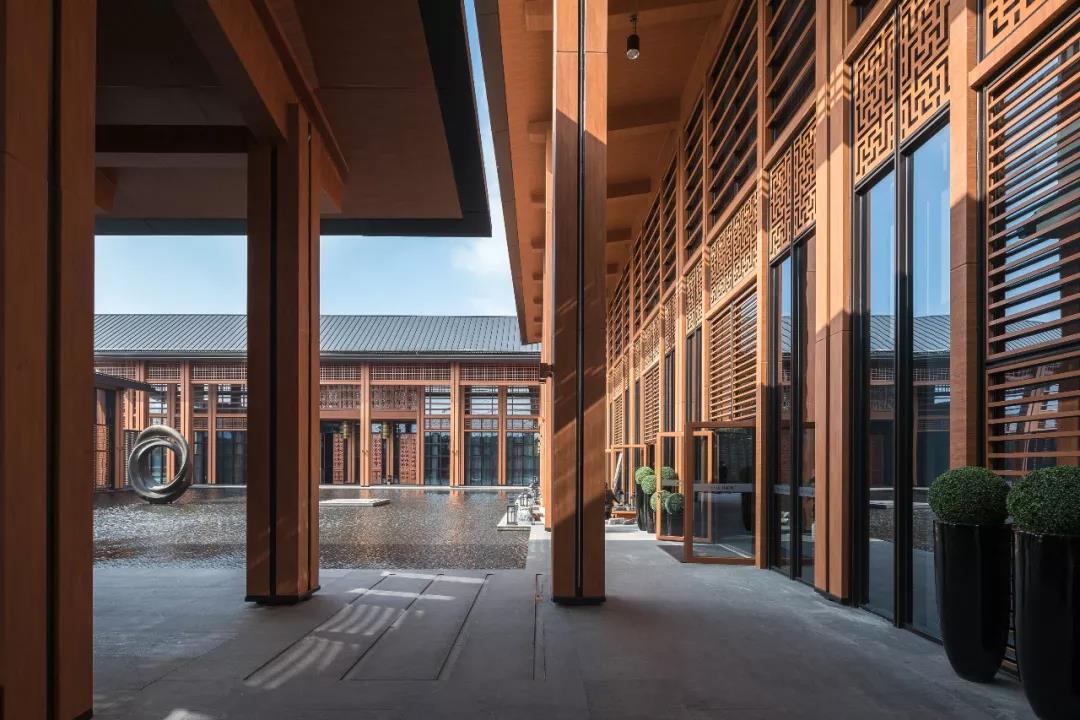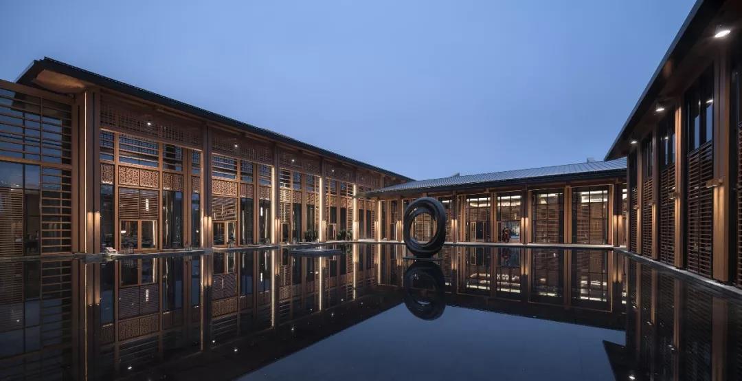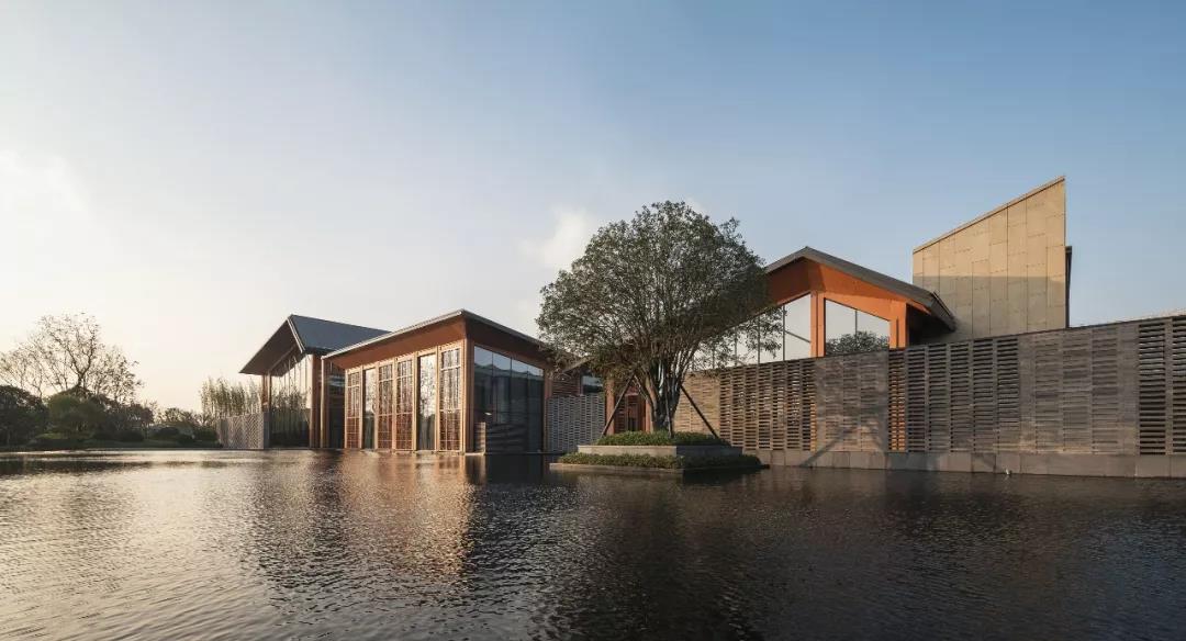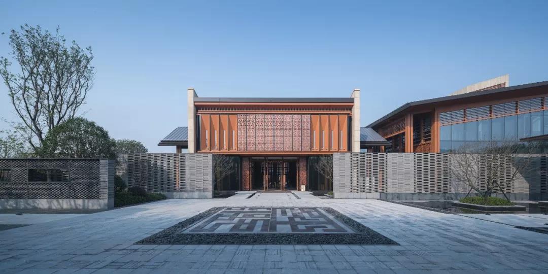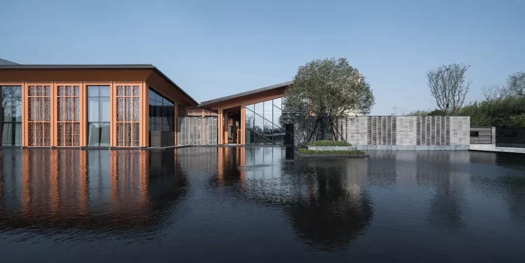 建筑傳承了徽派建筑四水歸堂的空間布局,以水為脈、以街為綱、以院為理,通過建筑體塊穿插錯動、屋頂的轉折、植物景觀的營造,形成“園”-“墻”-“廊”-“廳”的空間形式,園中有屋,屋中有院,以質樸、自然的姿態表達了一種委婉含蓄的詩情。