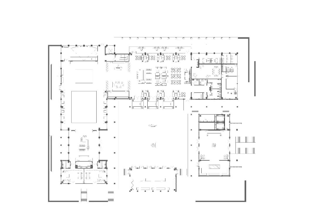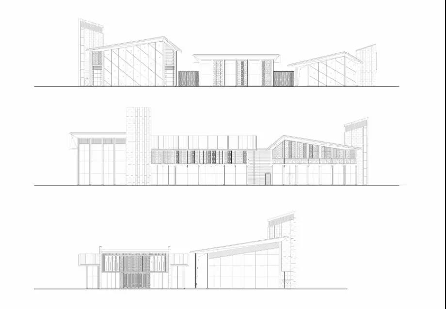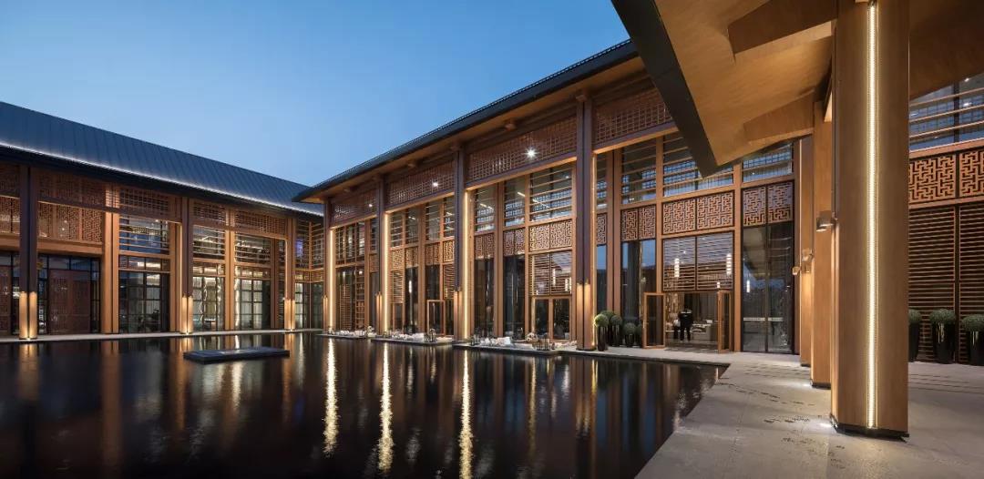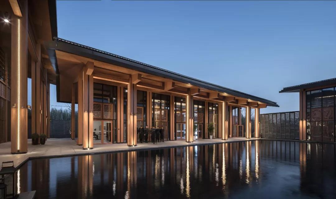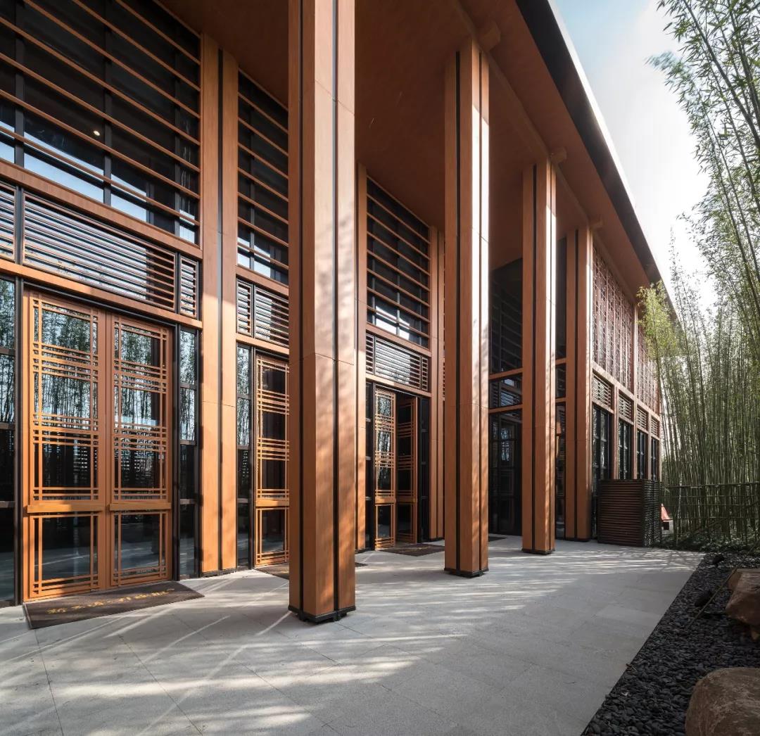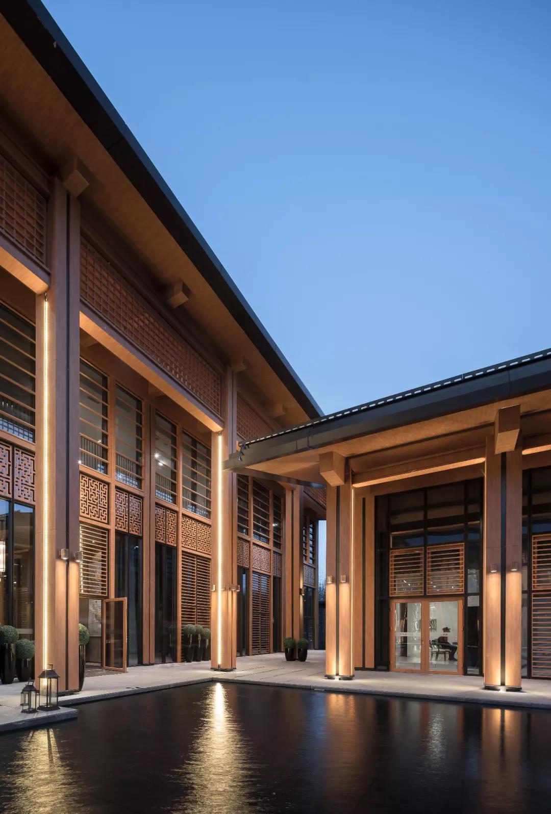 建筑傳承了徽派建筑四水歸堂的空間布局,以水為脈、以街為綱、以院為理,通過建筑體塊穿插錯動、屋頂的轉折、植物景觀的營造,形成“園”-“墻”-“廊”-“廳”的空間形式,園中有屋,屋中有院,以質樸、自然的姿態表達了一種委婉含蓄的詩情。