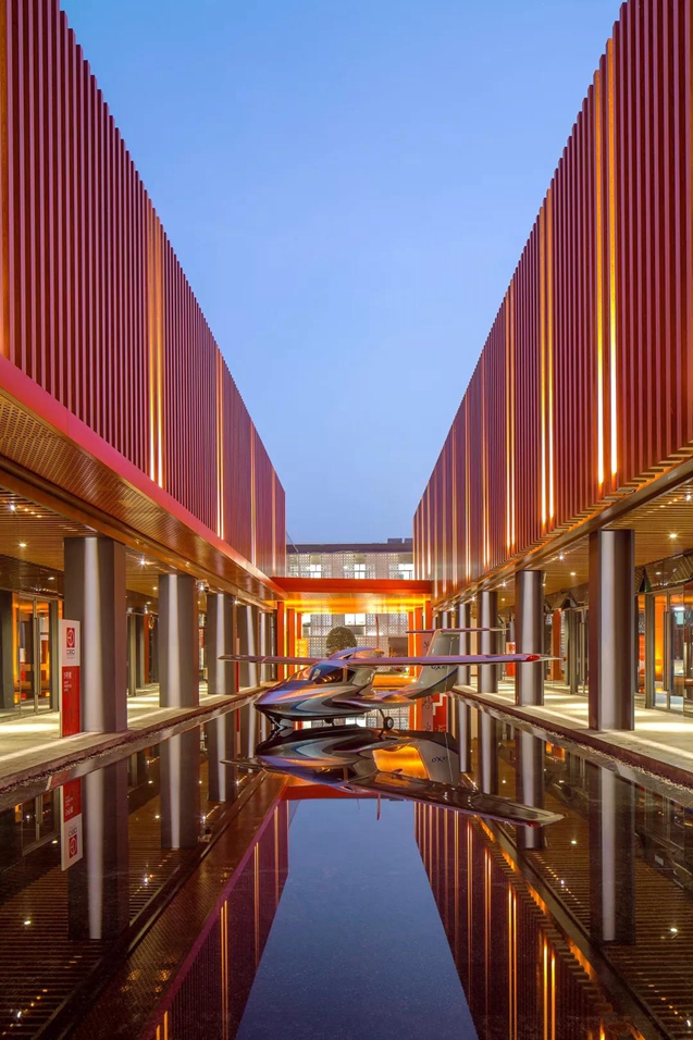 30公分鏡面薄水與飛機模型交映,化解建筑體量感。開放木質平臺,在親水的環境下配合局部開敞的草地和喬灌木,形成錯落有致的戶外交流空間。