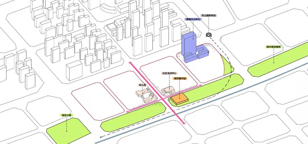 整個項目中結合城市規劃綠地,打造為綠軸邊上的多主體的城市花園型綜合居住社區。交流與互動需求、功能變化與銜接、建筑與景觀的融合性思辨等諸多復雜挑戰,使項目產生了在哲學意味上曖昧而溫和的不界定的結論,最終結合圖書館和幼兒園、社區中心,創造了一個積極而富有生機活力的街區。
