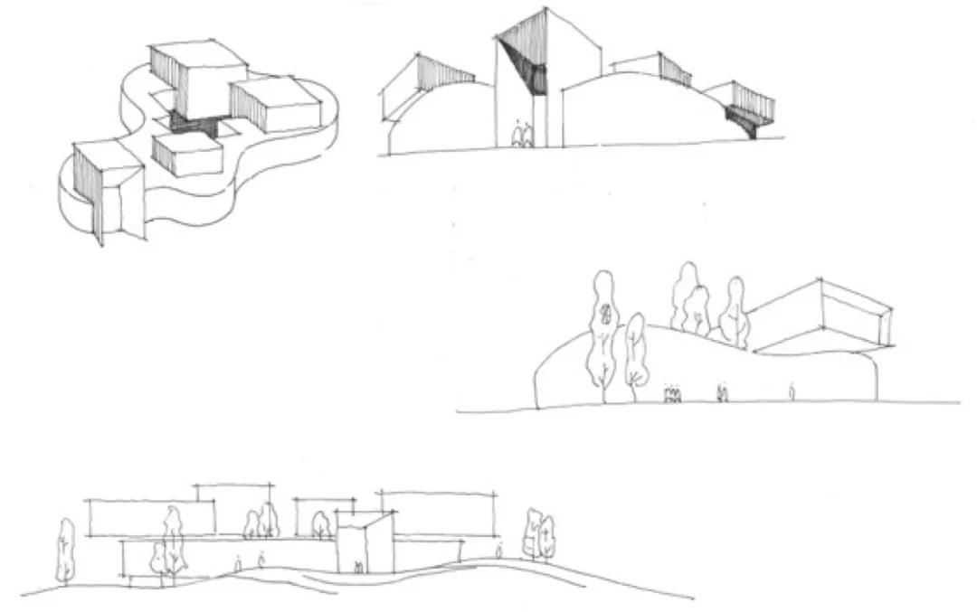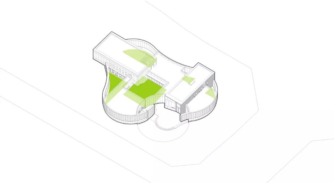 平面布局設置中將場地中央作為室外活動中心,幾乎所有交通流線組織、空間內外轉換都圍繞場地中心展開,周邊的建筑實體在迎合中心形虛而神實的召喚中,產生著不確定的扭動與流動,體量由此愈加有趣而豐富。