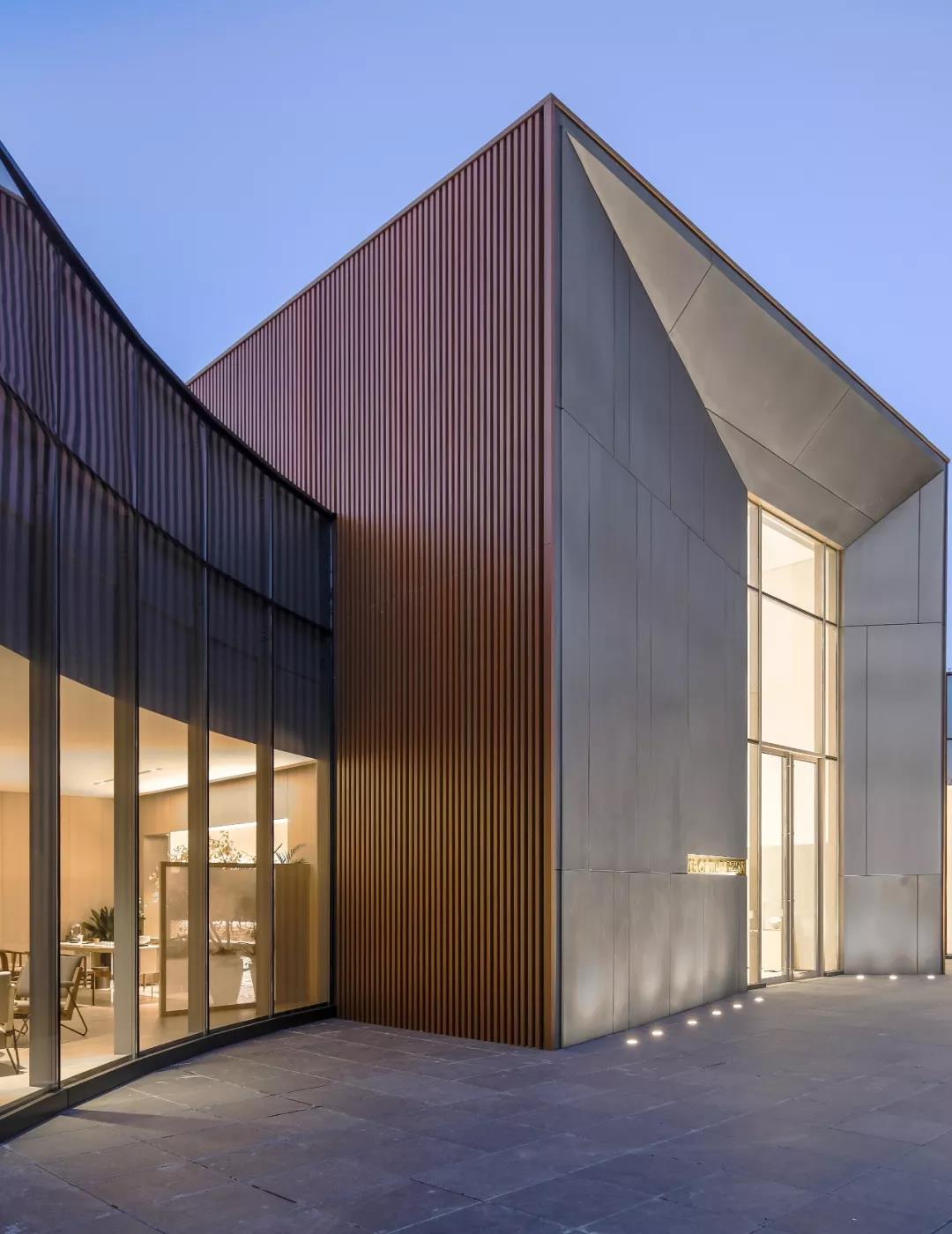 大面積黑白灰的運用使得建筑本身的雕塑感更為強烈,褐色的點綴帶來溫度感。而玻璃的穿插與水的流動則打消了可能的沉悶,水是輕盈,也是吸引,玻璃則聯通室內外空間,帶來光與影、空間與時間的對話。白天或者黑夜,自然亦或匠心,光的穿插給予這座雕塑空間通透之感,虛虛實實,似城市中一座浮島。