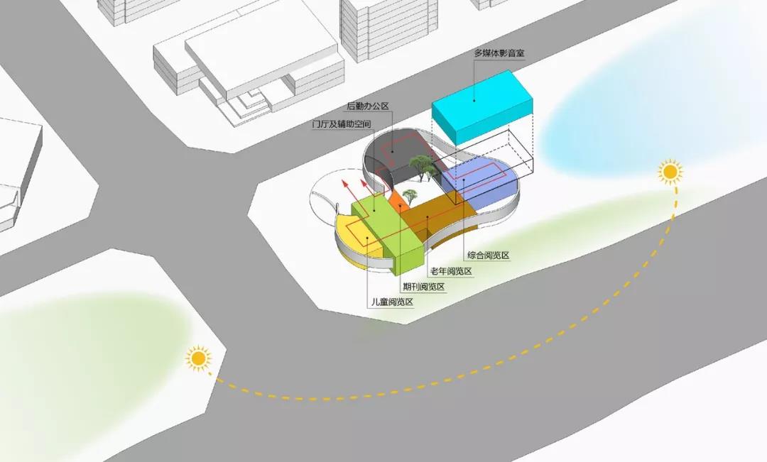 圖書館設計之初,由立方體為始,通過不同的構造手法,經由減缺、覆疊之后,最終以一抹彎曲界面為主體,巧妙的與周圍環境相適應,同時表現自身柔和中不失棱角的獨特。我們創建一座浮島,但絕不希望她是孤獨的。城市廣場、城市主干道和綠地景觀相互交織影響,給公眾帶來一場別樣的體驗。