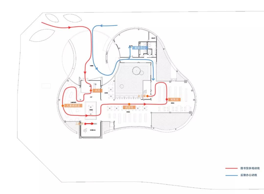 室內空間是建筑外部空間、建筑形態元素的延續和衍生,我們希望在這樣一條洄游線中,人與空間可以達到和諧統一,從而造就建筑功能性之外的精神歸屬感。這樣的洄游線處于室內,卻也延伸至外,溝通了建筑、景觀與公眾的關系,像是眼中所見之物各自連接,各自安排,都處于這條線中。它是不斷延伸的,跟隨我們腳步,走出這里的地塊,向整個城市發展。