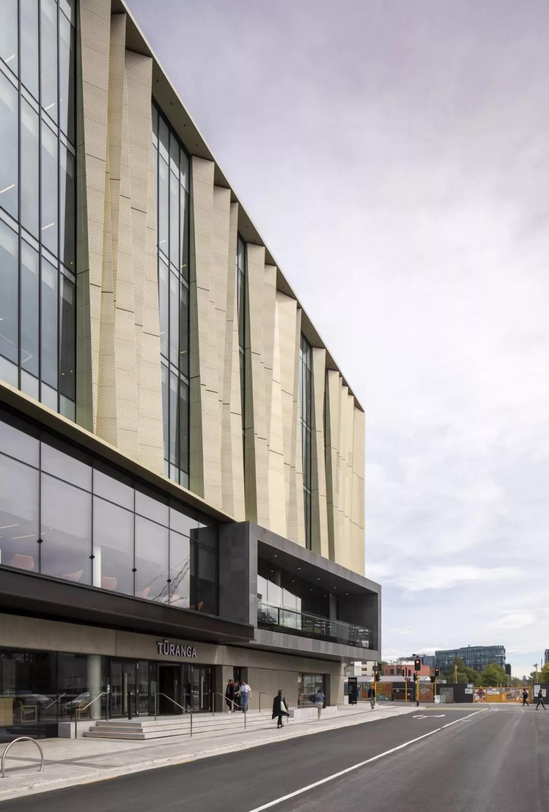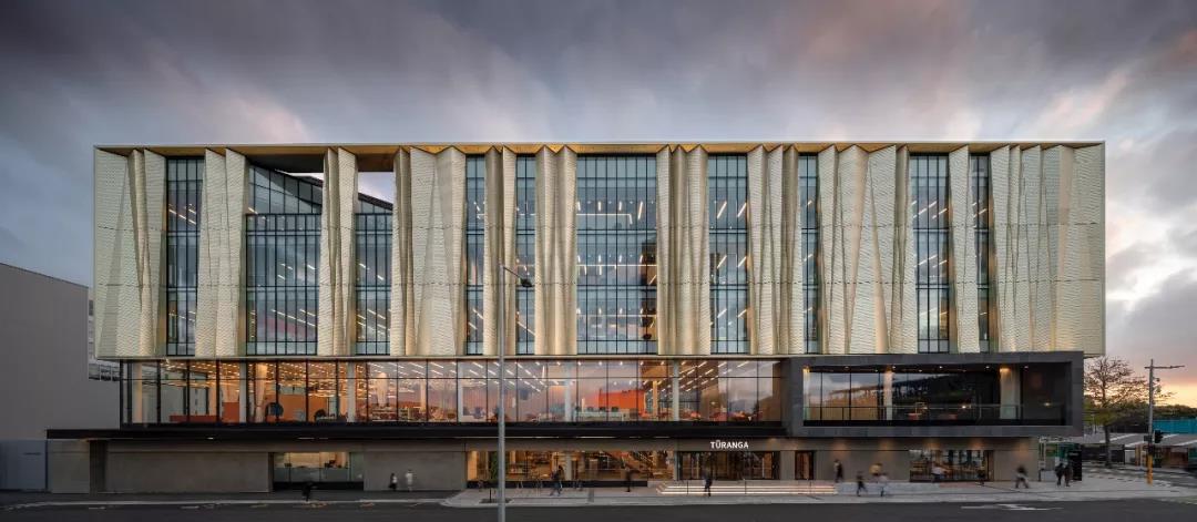 作為一種彰顯部落文化的象征,籠罩在建筑物醒目幾何立面外的金色面紗具有震撼的視覺效果,描繪出日落時分最后一縷陽光所帶來光澤的深度。面紗擺動的形態(tài)來源于圖書館上層望出去起伏的群山,以及當?shù)?/span> harakeke 亞麻瘦長厚實的葉片,它是當?shù)貍鹘y(tǒng)文化習俗中一種重要的自然元素。