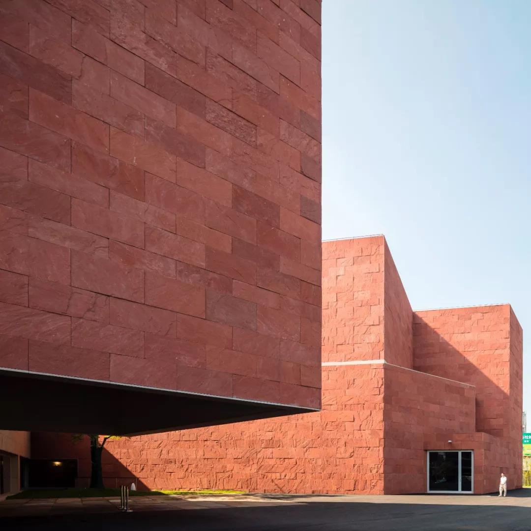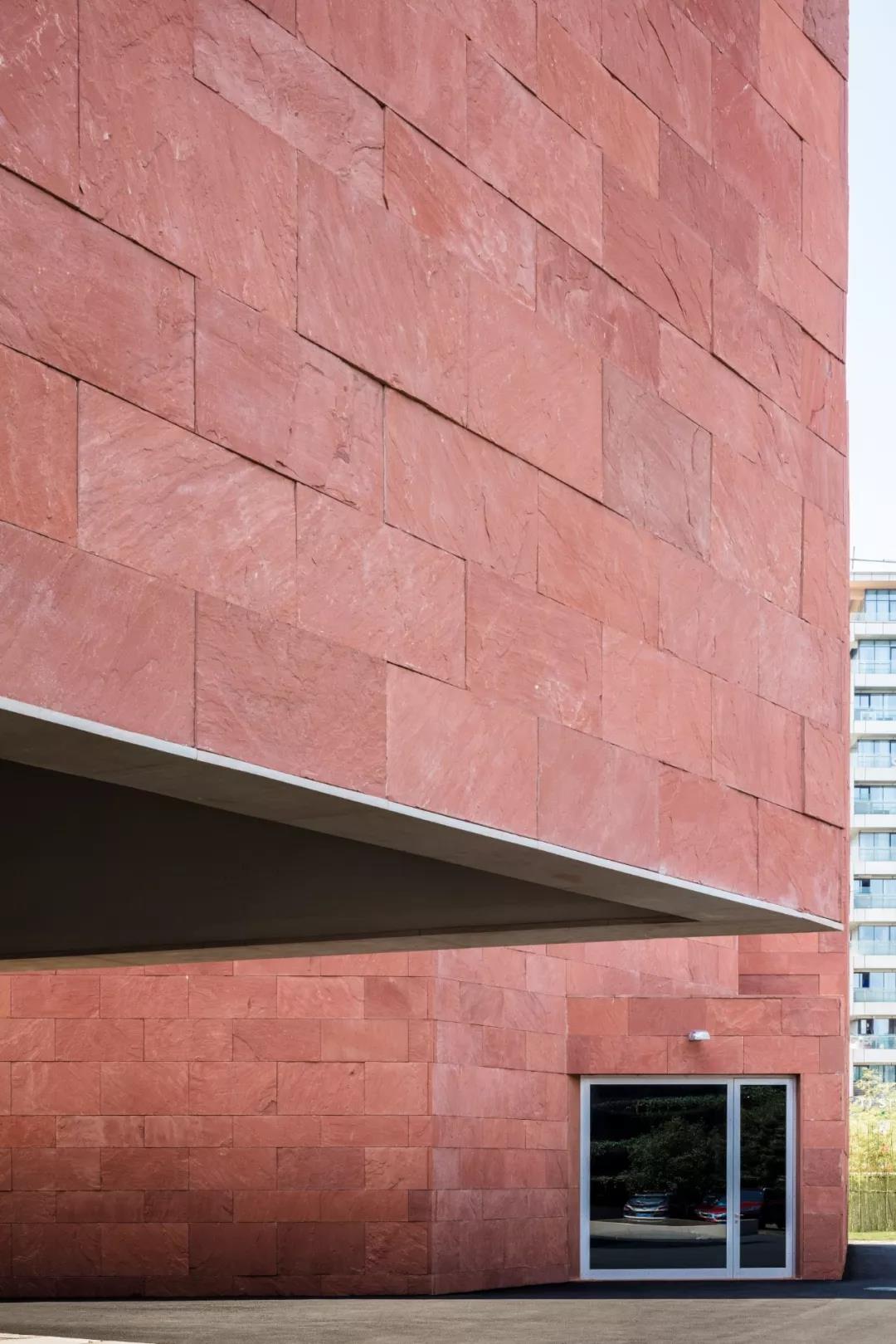 建筑由兩個以鈍角排列的大棱柱體和一個將它們連接在一起的小體量組成,構成了一個三角形露臺。建筑的外墻用紅色的砂巖覆蓋,上面有幾塊謹慎小心地插入的白色大理石,這與與西扎最具代表性的葡萄牙項目有所不同;然而,這個棱角分明的幾何結構在被照亮的一面和有陰影的一面之間建立起了一種張力,這種表現形式在他的作品中經常出現。