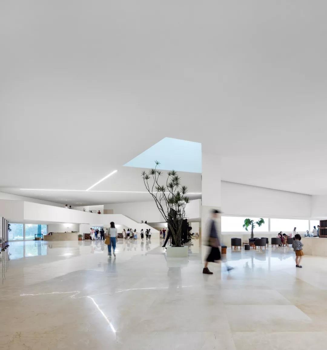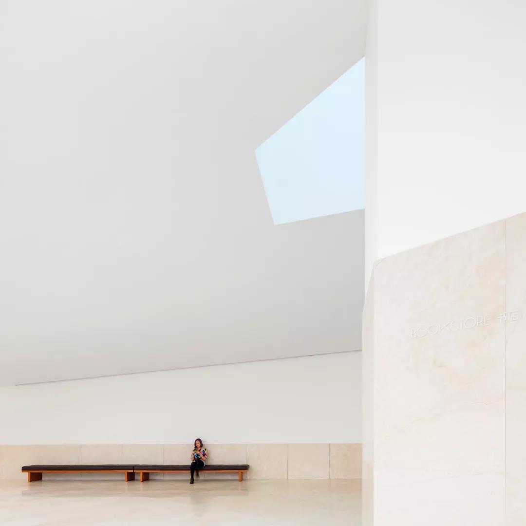 博物館的各項室內功能設施分布在了不同的樓層。 而這種有意識的開口設計將建筑周圍的景觀都納入到了這個開口的框架之中