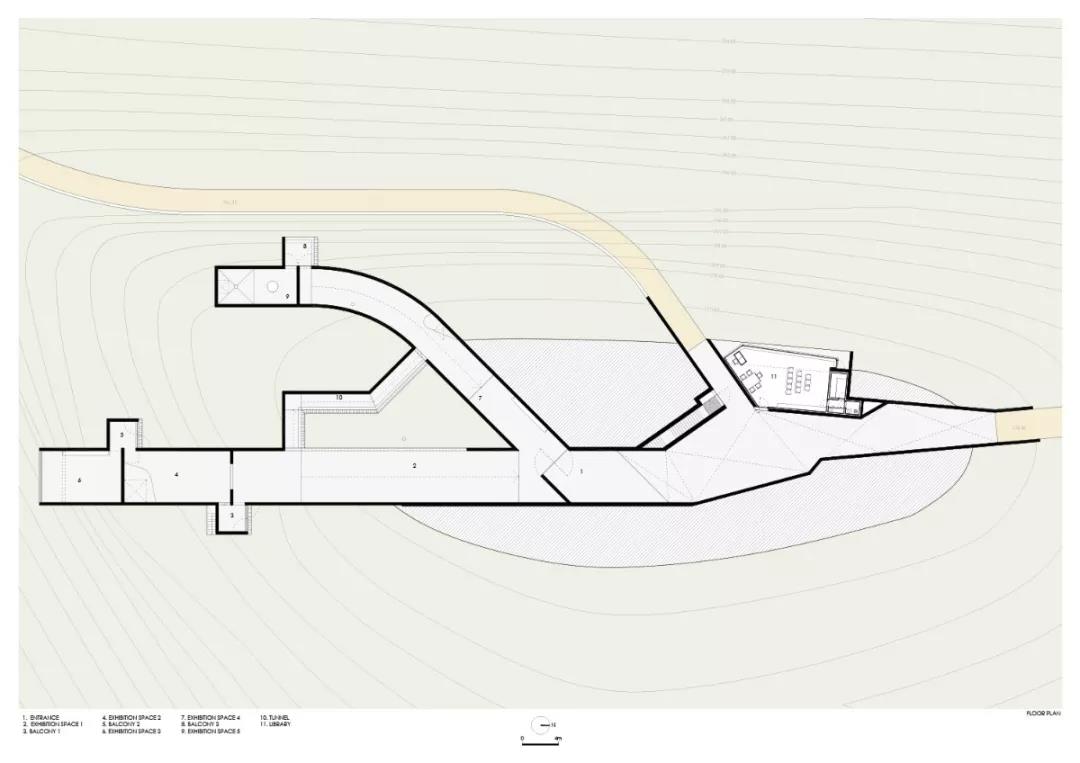 從這個入口空間開始,參觀者就開始進入到一個洞穴狀的建筑中,該建筑由兩個彼此平行但在端部有所交匯、以隧道相連的體量組成。