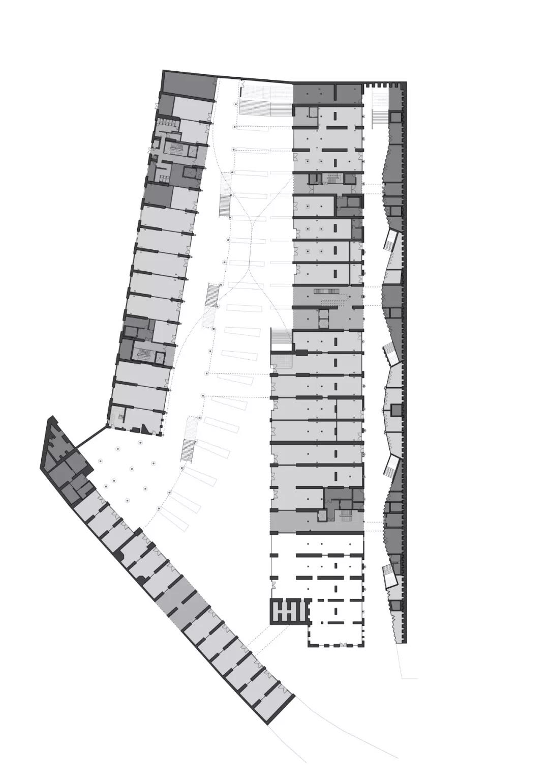 這樣就形成了一個全新的懸空層,以及它下方的室外空間,作為整個場地的焦點區域。另外,我們還設計了流動型的動線,將兩個高架橋和它們之間的庭院連接成為一個有機的整體。