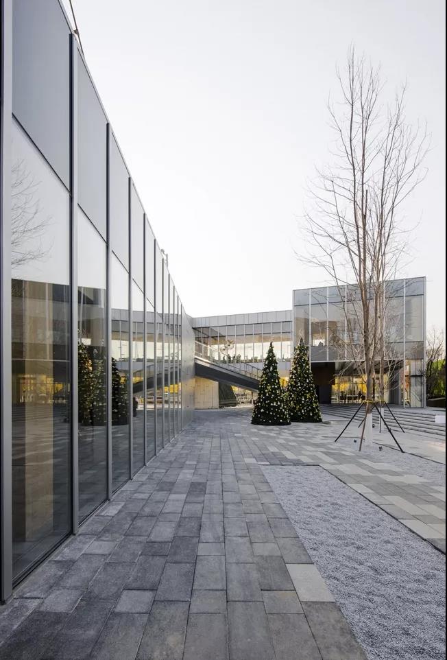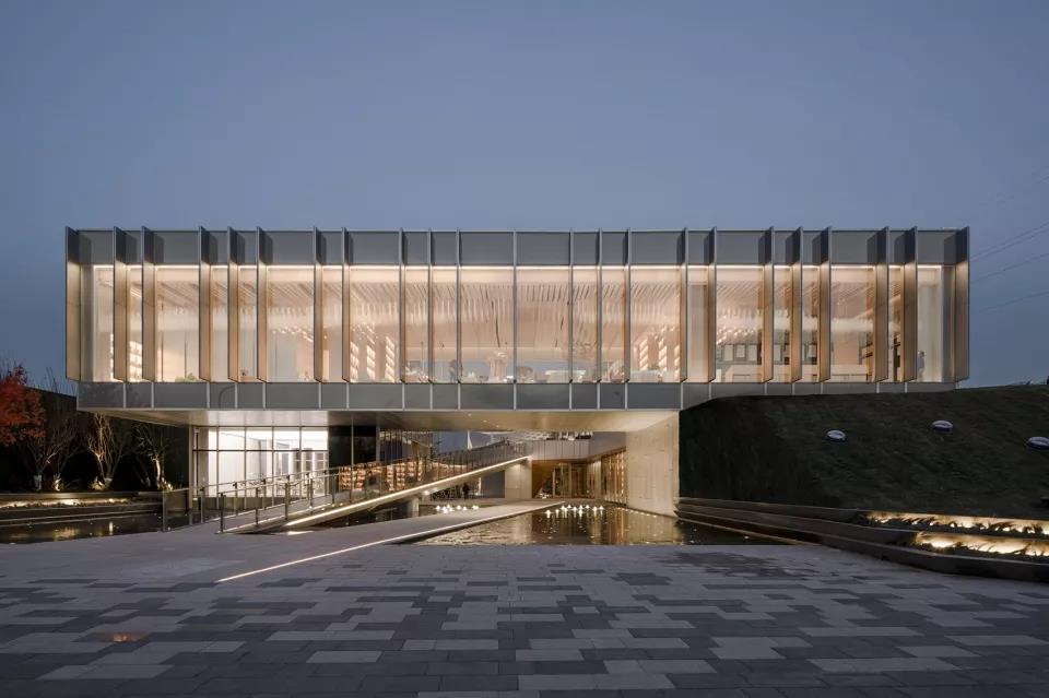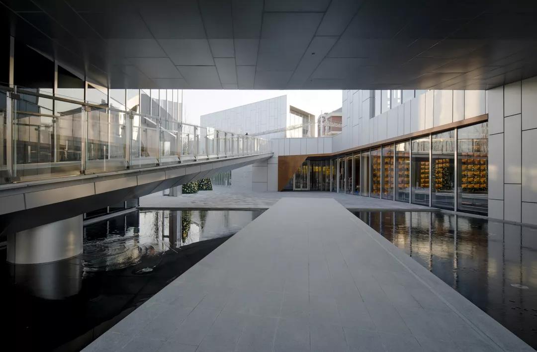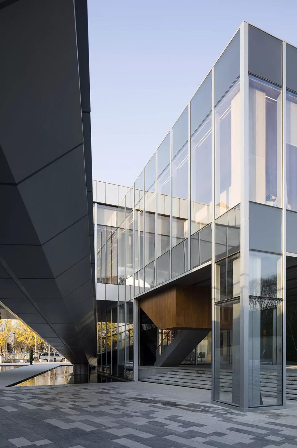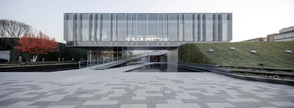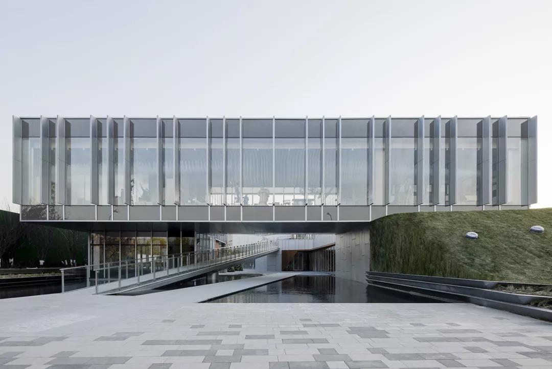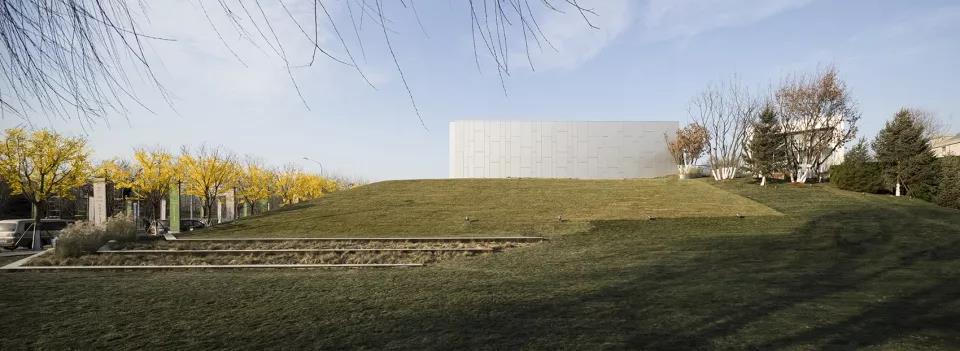 從基地南邊遠(yuǎn)遠(yuǎn)望去,銀灰色的建筑安靜地被置于草坡之上,方正的形體與漫反射鋁板的材質(zhì)形成戲劇化的體驗,使建筑似是輪廓分明,又似是與背景天空融為一體。沿著西側(cè)主入口的方向漸漸接近,建筑的面貌再次發(fā)生根本性的改變——從南側(cè)完全封閉的鋁板表皮,到西側(cè)完全通透的超白玻幕墻;從南側(cè)呈現(xiàn)自然狀態(tài)的綠草如茵的草坡,到西側(cè)大跨度的底層架空、人工設(shè)計感極強(qiáng)的水池和金屬坡道,仿佛建筑本身切割開了兩個風(fēng)格全然不同的世界。