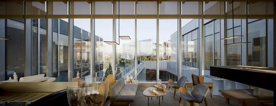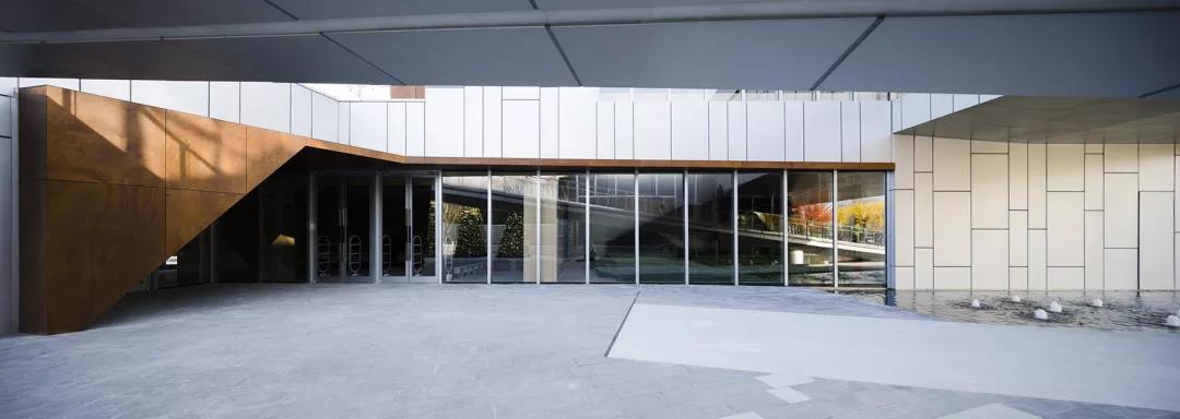 如果說建筑自身風(fēng)格與形式方面的“自由”只是詮釋了自由的一個方面,那么建筑師在設(shè)計中無疑試圖表達(dá)了更多。建筑主體方正、沉穩(wěn)的體量與西側(cè)那一條充滿力量感和動感的坡道的組合,庭院里幾何分割棱角分明的臺階、水景與延續(xù)了南側(cè)整個立面自然態(tài)的草坡的對比和融合,作為主材質(zhì)的玻璃和鋁板清冷、堅硬的質(zhì)感對多處點綴的Parklex木紋板溫暖而親近自然的柔和感的襯托,無一不在喻示著本身的矛盾性和復(fù)雜性。正如羅伯特·文丘里所說,現(xiàn)代建筑往往是以犧牲多樣而復(fù)雜的東西為代價,來將建筑中原始而基本的東西理想化,因此在面對更復(fù)雜、變化更快的世界時會變得軟弱而無力。而能深刻有力地滿足人們心靈需求的美,都是來自內(nèi)在的復(fù)雜性。