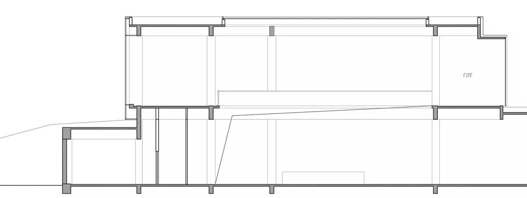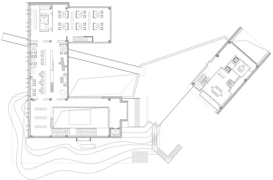 從建筑正面看去,輕盈而閃耀著金屬光澤的坡道宛如懸浮,與水池之上的道路在平面投影上呈現(xiàn)互相平行的關(guān)系。這樣的關(guān)系喻示著兩者在流線方面高度的并列性,并不刻意強(qiáng)化其中一種,而更多地突出并存的“可能性”。這兩條通路通過建筑內(nèi)部的流線融合在一起,形成一個完整的環(huán)線,這即是建筑中主要的流線組織方式,更少強(qiáng)調(diào)“順序”“方向性”,更注重不同區(qū)域間流線相互的融合與串聯(lián)。
