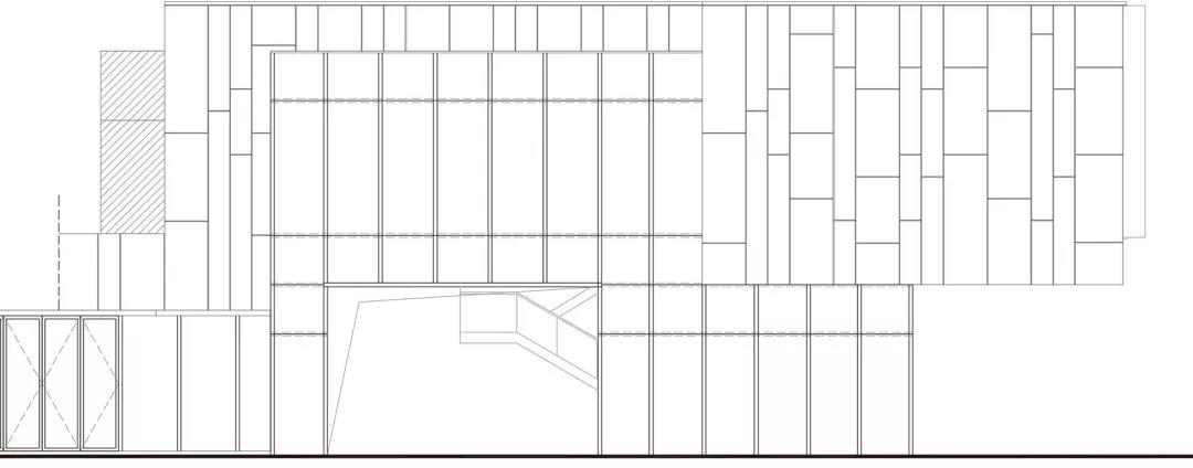 建筑西立面上豎向的不規(guī)則排列的鋁板,不僅僅是立面造型的元素,同時也是遮擋西曬的遮陽板。從側(cè)面看過去,鋁板和玻璃幕墻互相形成彼此的反射,模糊了室內(nèi)外的界限,提供了一種曖昧的美感。