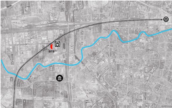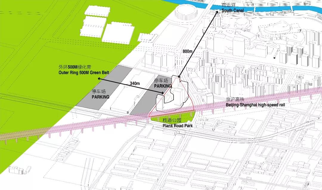 項(xiàng)目距離外環(huán)線500米綠化帶340米,距離南運(yùn)河華僑城水街800米。東側(cè)有寬廣的停車場(chǎng),北側(cè)京滬高鐵高架從地塊邊界通過,高架下已建成一處棧道公園。項(xiàng)目東側(cè)與停車場(chǎng)之間退讓出一個(gè)半圓形廣場(chǎng),在建筑體量圍合之中,成為本區(qū)域最大的開放空間,容納多種商業(yè)活動(dòng)和市民文化生活。項(xiàng)目北側(cè)建筑立面,具有棧道公園綠地景觀。