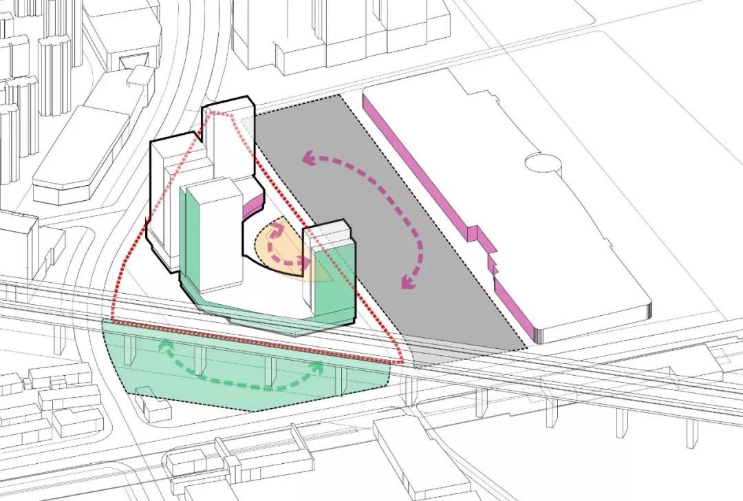 為了減少對(duì)基地對(duì)周邊交通的影響,適當(dāng)設(shè)置基地的出入口,最小化出入口的數(shù)量。首先在基地東側(cè)設(shè)置規(guī)劃道路,溝通阜盛道和萬卉道,將主要入口置于規(guī)劃道路上,以此減少在城市干道上的開口。此外于基地西北側(cè)沿高鐵綠化帶設(shè)置車行路溝通萬卉道和規(guī)劃道路,并于建筑主體西南轉(zhuǎn)角處向萬卉道開設(shè)出入口。如此,形成萬卉道上3個(gè)、阜盛道上1個(gè)共4個(gè)面向城市主干道的主要出入口。