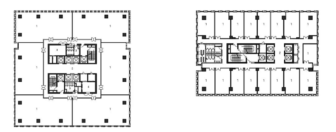 裙房商業(yè)部分內(nèi)設(shè)置自動(dòng)扶梯供人流上下,輔助廂式電梯,其中A區(qū)、B區(qū)內(nèi)各設(shè)有2部自動(dòng)扶梯和四組共8部廂式電梯,每組廂式電梯中各有1部共4部下至地下停車場(chǎng)。塔樓辦公部分則通過高速電梯聯(lián)通上下,其中A1、B1內(nèi)各有2部消防電梯和5部客用電梯,2部消防電梯和1部客用電梯共3部下至地下停車場(chǎng);A2、B2內(nèi)各有1部消防電梯和4部客用電梯,1部消防電梯和1部客用電梯共2部下至地下車庫(kù)。